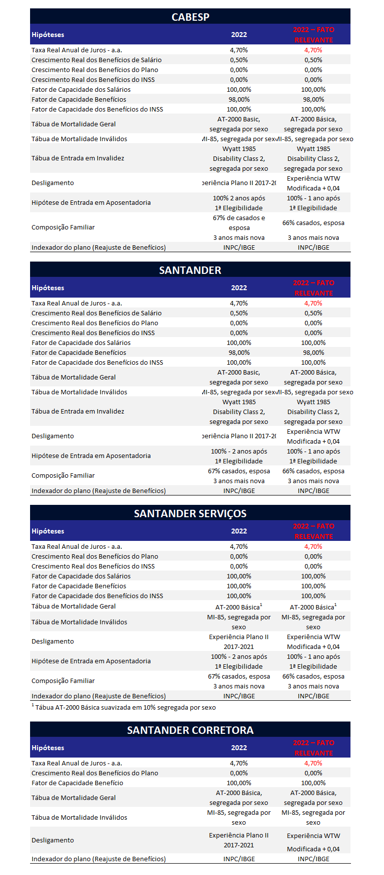 Cabe registrar que para os Planos Banesprev I, II, DAB, DCA, Caciban e Sanprev I, foi elaborado estudo técnico de convergência da Taxa Real de Juros no primeiro semestre de 2022 para selecionar a taxa a ser utilizada na avaliação atuarial por fato relevante devido à migração ocorrida nos respectivos Planos de Benefícios. Em função da validada das premissas, elas foram utilizadas no encerramento do exercício de 2022.
