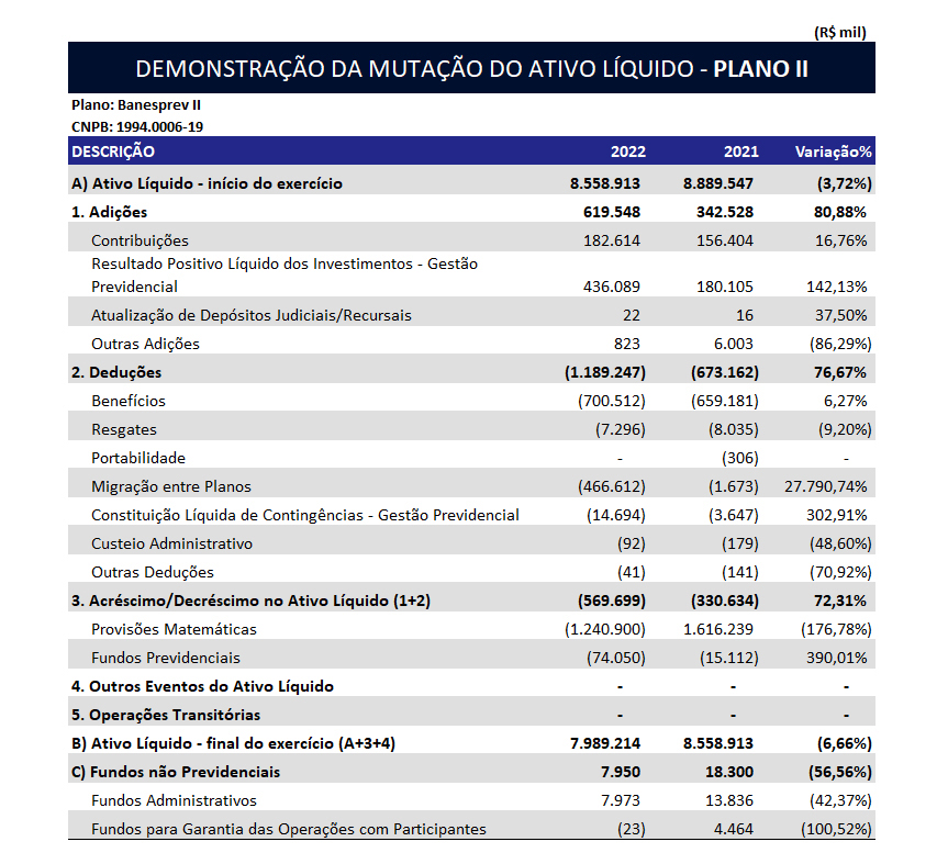 Cabe registrar que para o Plano Banesprev II foi elaborado estudo técnico de convergência da Taxa Real de Juros no primeiro semestre de 2022 para selecionar a taxa a ser utilizada na avaliação atuarial por fato relevante devido à migração ocorrida nos respectivos Planos de Benefícios. Em função da validada das premissas, elas foram utilizadas no encerramento do exercício de 2022.