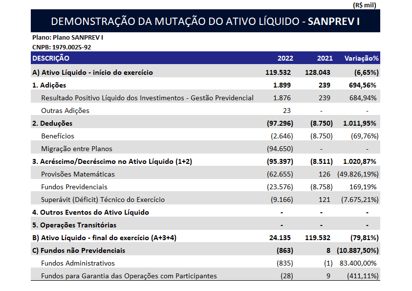 Cabe registrar que para o Plano SANPREV I, foi elaborado estudo técnico de convergência da Taxa Real de Juros no primeiro semestre de 2022 para selecionar a taxa a ser utilizada na avaliação atuarial por fato relevante devido à migração ocorrida nos respectivos Planos de Benefícios. Em função da validada das premissas, elas foram utilizadas no encerramento do exercício de 2022.